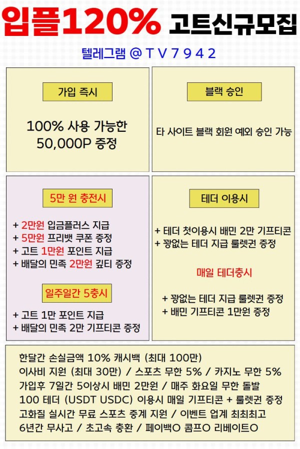 ♦️♦️입플120%+깊티5만+테더이벤+매일출석룰렛+매충입플+롤링100%+USDT가능♦️♦️