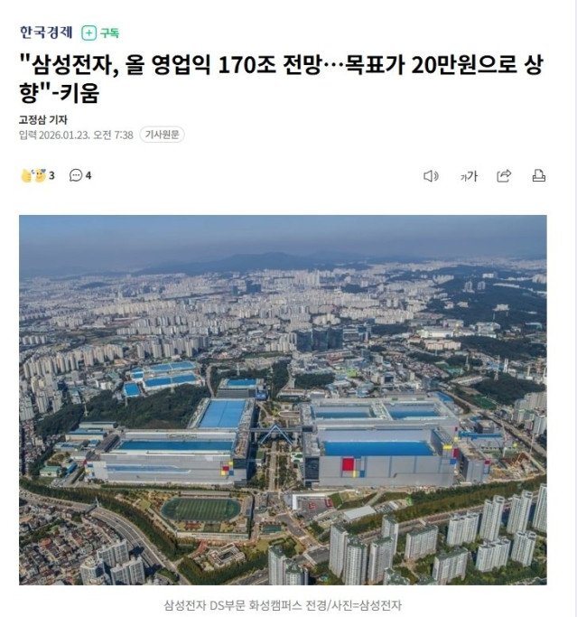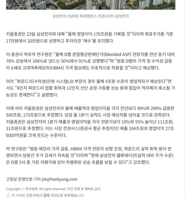 "삼성전자, 올 영업익 170조 전망…목표가 20만원으로 상향"-키움 작성자 정보 민사마 작성 작성일 2026.01.23 08:37 컨텐츠 정보 158 조회 목록 본문 이제 영업이익 기존 150조원 예상에서 170조원 예상까지 나옵니다 삼전 파운드리는 올해도 적자 예상인데 메모리 반도체 가격폭등으로 올해 삼전과 화이닉스가 TSMC의 영업이익을 제칠 가능성이 높습니다 관련자료 댓글 0 등록된 댓글이 없습니다. 로그인한 회원만 댓글 등록이 가능합니다. 목록
