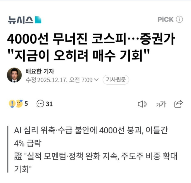 "4000 무너진 코스피''' 증권가 오히매수 적기“