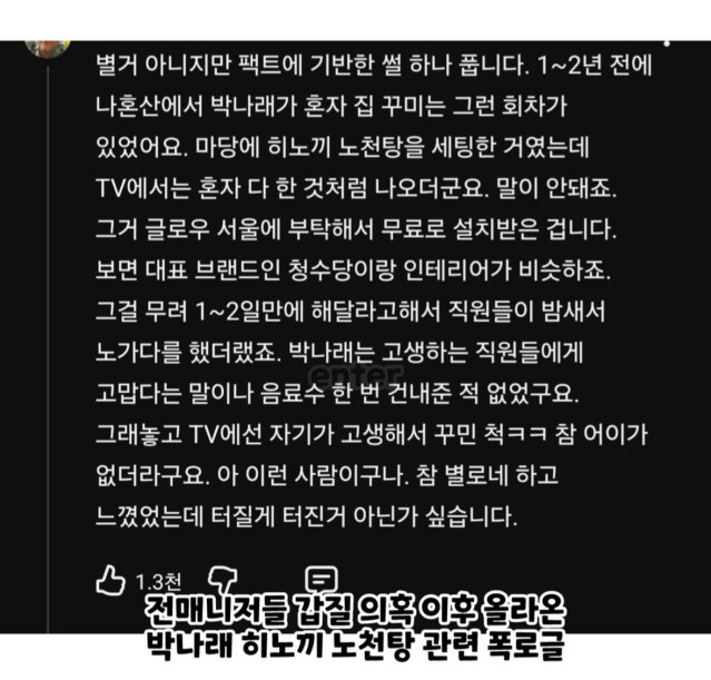 박나래 히노끼탕 혼자 설치한 척 했다는 폭로글