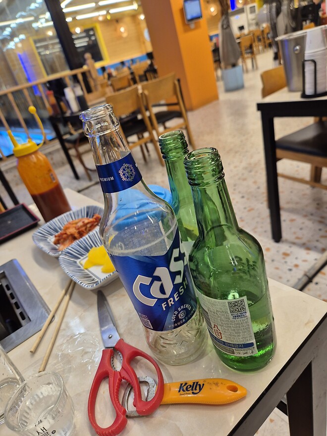 숙소 인근에 사람들 북적북적 거리는 해물칼국수 집이 있길래 ㅋㅋ 들뜨는 마음으로 바로 들어가서 해뭉 칼국수2인분에 소주2 맥주1 먹고 나옴.