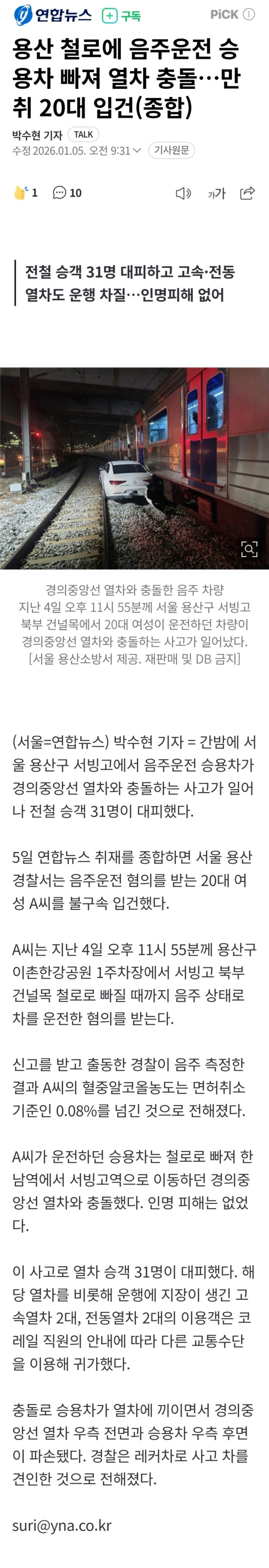 용산 철로에 음주운전 승용차 빠져 열차와 충돌.jpg