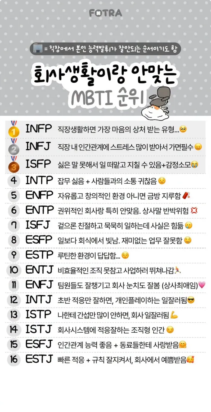 회사생활과 안 맞는 MBTI 순위