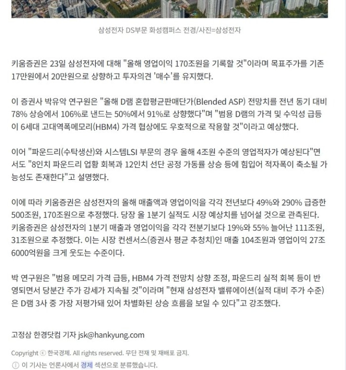 "삼성전자, 올 영업익 170조 전망…목표가 20만원으로 상향"-키움 작성자 정보 민사마 작성 작성일 2026.01.23 08:37 컨텐츠 정보 4 조회 목록 본문 이제 영업이익 기존 150조원 예상에서 170조원 예상까지 나옵니다 삼전 파운드리는 올해도 적자 예상인데 메모리 반도체 가격폭등으로 올해 삼전과 화이닉스가 TSMC의 영업이익을 제칠 가능성이 높습니다 관련자료 댓글 0 등록된 댓글이 없습니다. 로그인한 회원만 댓글 등록이 가능합니다. 목록