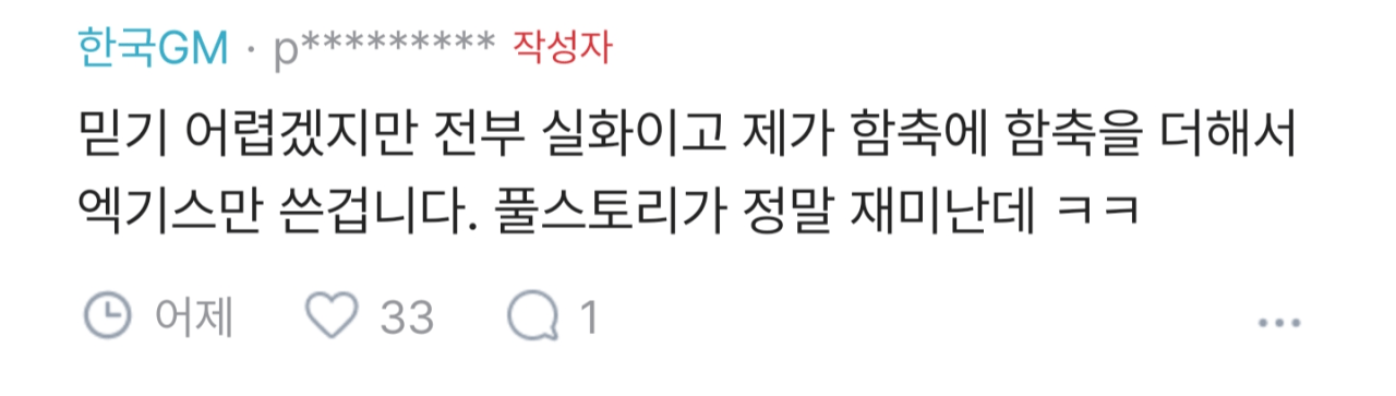 믿기 어려운 어느 회사 임원 썰 작성자 정보 벳프라임 작성 작성일 2026.02.03 12:04 컨텐츠 정보 0 조회 목록 본문 어메이징 GM 관련자료 댓글 0 등록된 댓글이 없습니다. 로그인한 회원만 댓글 등록이 가능합니다. 목록