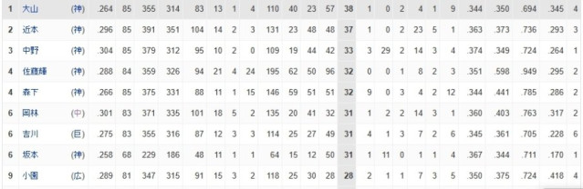 3. 나카노(한신) 33개 팀내 2번타자
