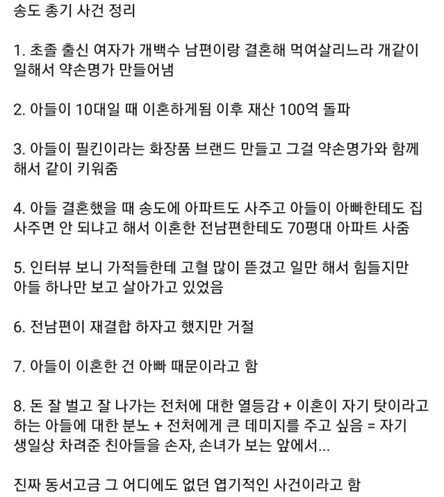 결국 전처가 가장 아끼는 존재를 없애서 고통준다는 마인드로 친아들 죽인거