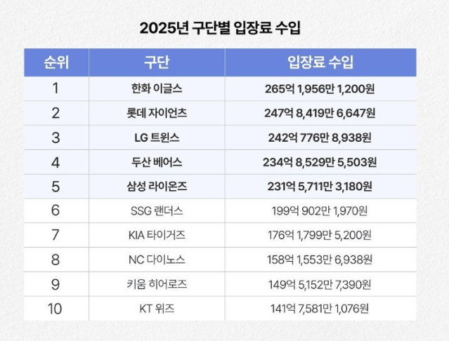 2025년 구단 입장료 수입 순위