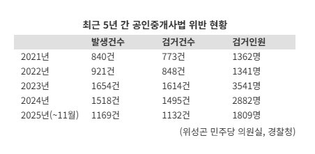 7일 본지가 국회 행정안전위원회 소속 위성곤 더불어민주당 의원실을 통해 경찰청으로부터 제출받은 '최근 5년간 공인중개사법 위반 현황'에 따르면 공인중개사법 위반 발생 건수는 2021년 840건에서 2023년 1654건으로 매년 증가했다. 2024년과 2025년(11월)에도 1518건, 1169건으로 1000건을 돌파했다.
