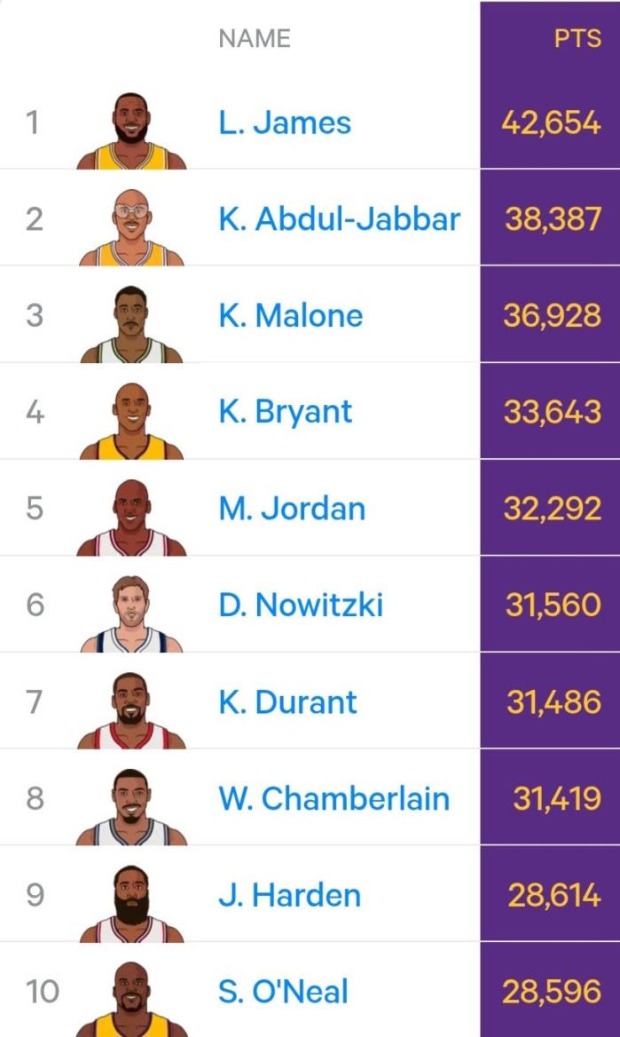 코비까지는 그래도 득점 좀 한다는 선수들 현실적인 최대치급이고 이마저도 상당한 난이도인데, 그보다 3,300득점 앞서는 칼 말론부터는 통곡의 벽 수준으로, 어지간한 내구성과 득점력을 갖춘 선수들조차 결코 넘기 어려운 '벽'이고 이걸 깨야 TOP 3 안에드는 영광을 차지할 수 있는데
