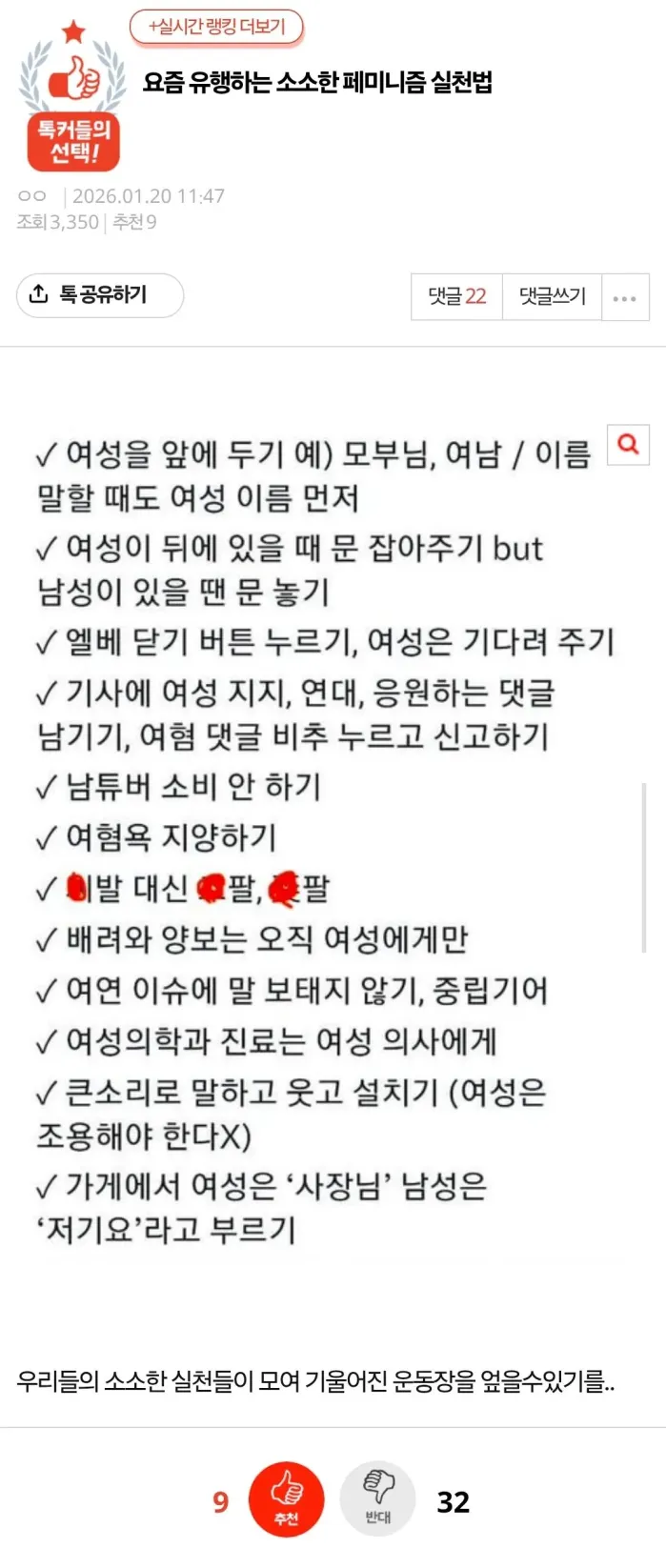 소소한 페미니즘 실천법 작성자 정보 갈릭소스 작성 작성일 2026.01.21 09:11 컨텐츠 정보 5 조회 목록 본문 그래 열심히 해라 .. 관련자료 댓글 0 등록된 댓글이 없습니다. 로그인한 회원만 댓글 등록이 가능합니다. 목록