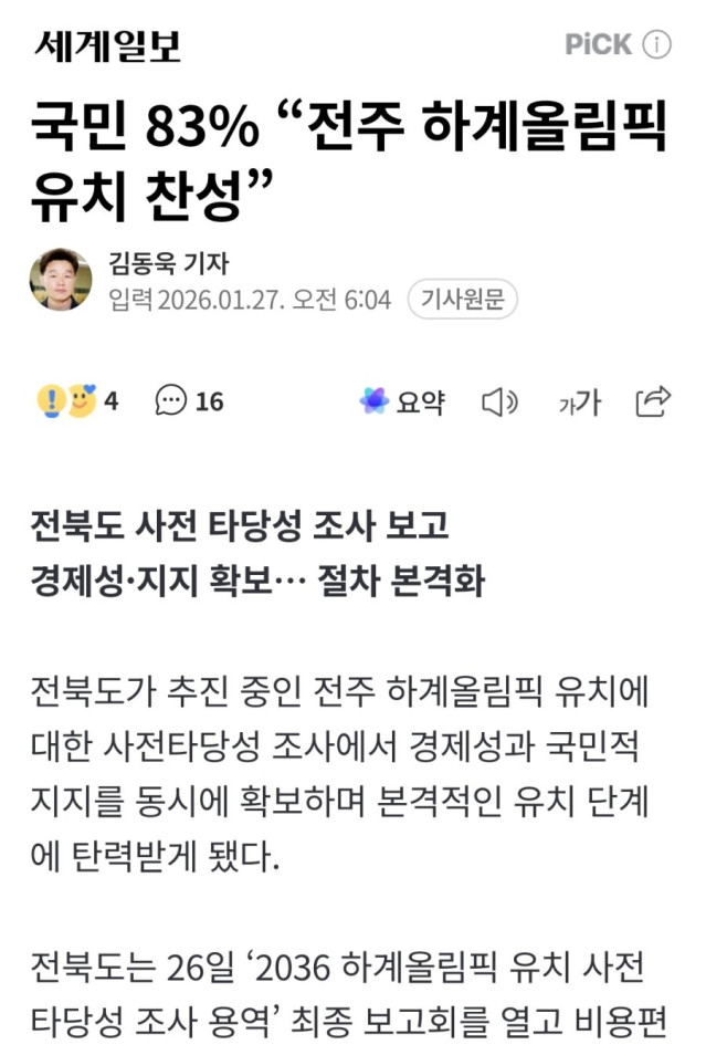 국민 83% “전주 하계올림픽 유치 찬성” 작성자 정보 한빛한빈 작성 작성일 2026.01.28 14:52 컨텐츠 정보 171 조회 1 댓글 목록 본문 난 올림픽 반댄데, 국민83% 전주올림픽유치 찬성 저게 찐일까요?전북은 니들은 그냥 아무것도 하지마.반도체 달라 올림픽 와라 어휴 관련자료 댓글 1 라쏭님의 댓글 라쏭 작성일 2026.01.28 14:53 그 뭐냐 청소년들 와서 한 거 그때 그거 보고도 뭐 하고 싶나? ㅋㅋㅋ 그 뭐냐 청소년들 와서 한 거 그때 그거 보고도 뭐 하고 싶나? ㅋㅋㅋ 로그인한 회원만 댓글 등록이 가능합니다. 목록