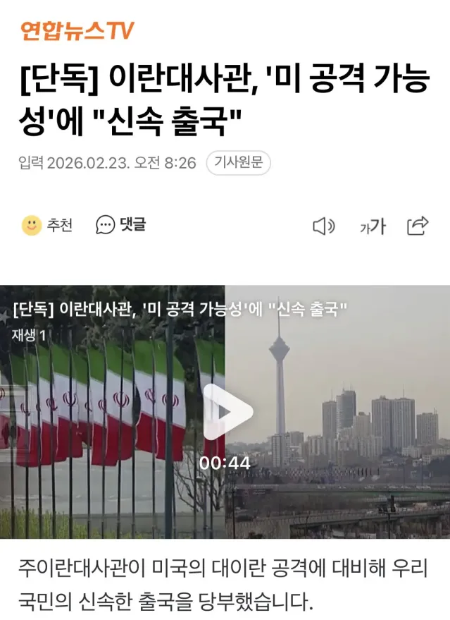 [단독] 이란대사관, '미 공격 가능성'에 "신속 출국" 작성자 정보 갈릭소스 작성 작성일 2026.02.23 08:32 컨텐츠 정보 6 조회 목록 본문 https://n.news.naver.com/article/422/0000836494?sid=100 관련자료 댓글 0 등록된 댓글이 없습니다. 로그인한 회원만 댓글 등록이 가능합니다. 목록