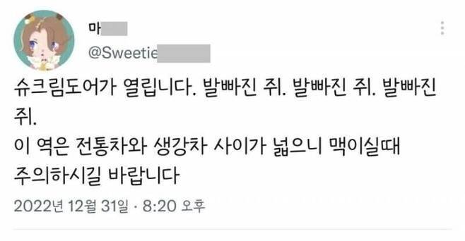 지하철 탈 때마다 듣는 소리 작성자 정보 바게트 작성 작성일 2025.10.11 10:08 컨텐츠 정보 90 조회 2 댓글 목록 본문 아 ㅇㅈ 관련자료 댓글 2 새벽서라님의 댓글 새벽서라 작성일 2025.10.11 10:08 발빠진 쥐 ㅋㅋㅋㅋㅋㅋ 발빠진 쥐 ㅋㅋㅋㅋㅋㅋ 미미짱님의 댓글 미미짱 작성일 2025.10.11 10:09 ㅋㅋㅋㅋ너만 그리 들리는게 아니었넹 ㅋㅋㅋㅋㅋㅋ ㅋㅋㅋㅋ너만 그리 들리는게 아니었넹 ㅋㅋㅋㅋㅋㅋ 로그인한 회원만 댓글 등록이 가능합니다. 목록